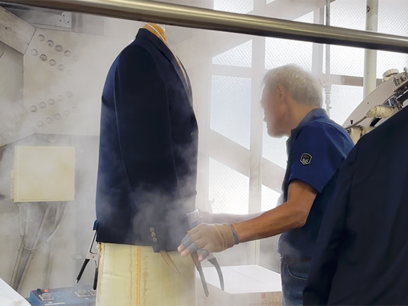 肩には肩プレス機、服全体には立体プレス機など専用のプレス機を使ってプレスをします。