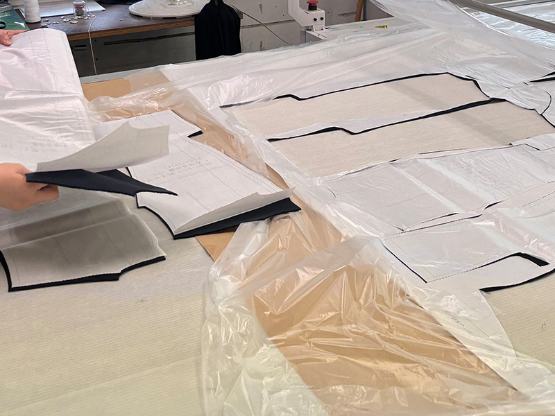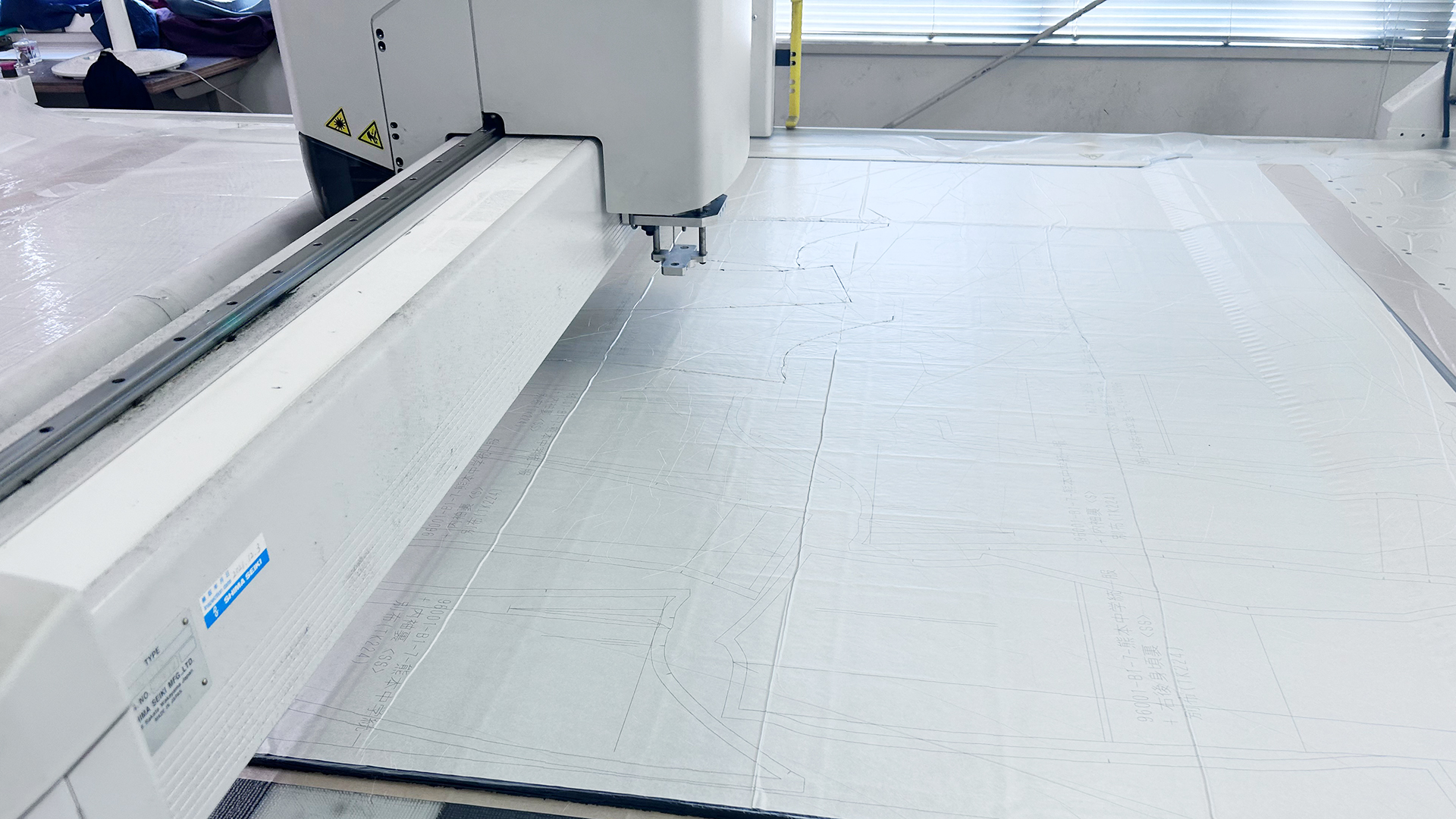 表地、裏地、芯地をそれぞれの型紙に合わせて自動裁断します。